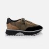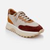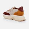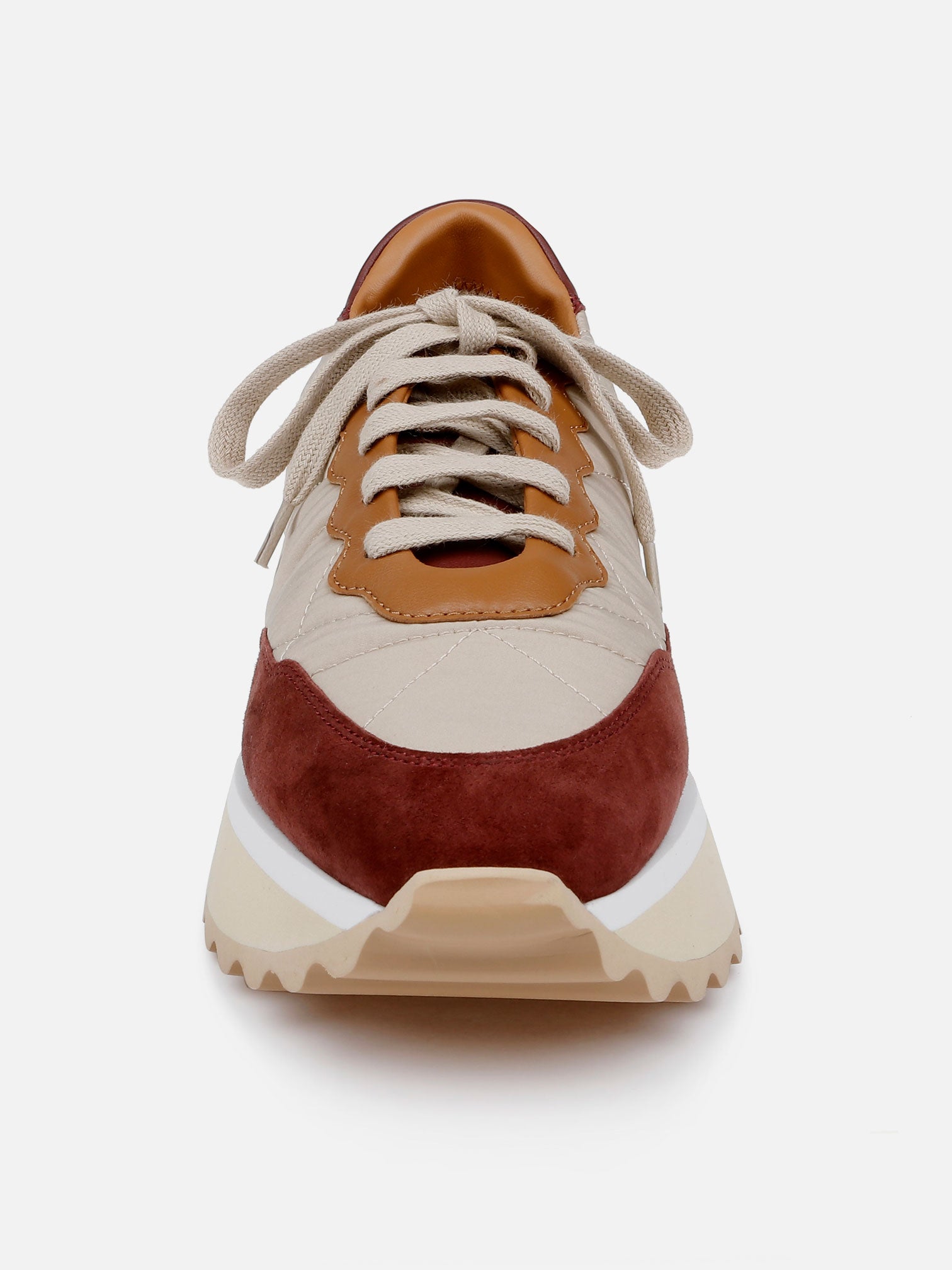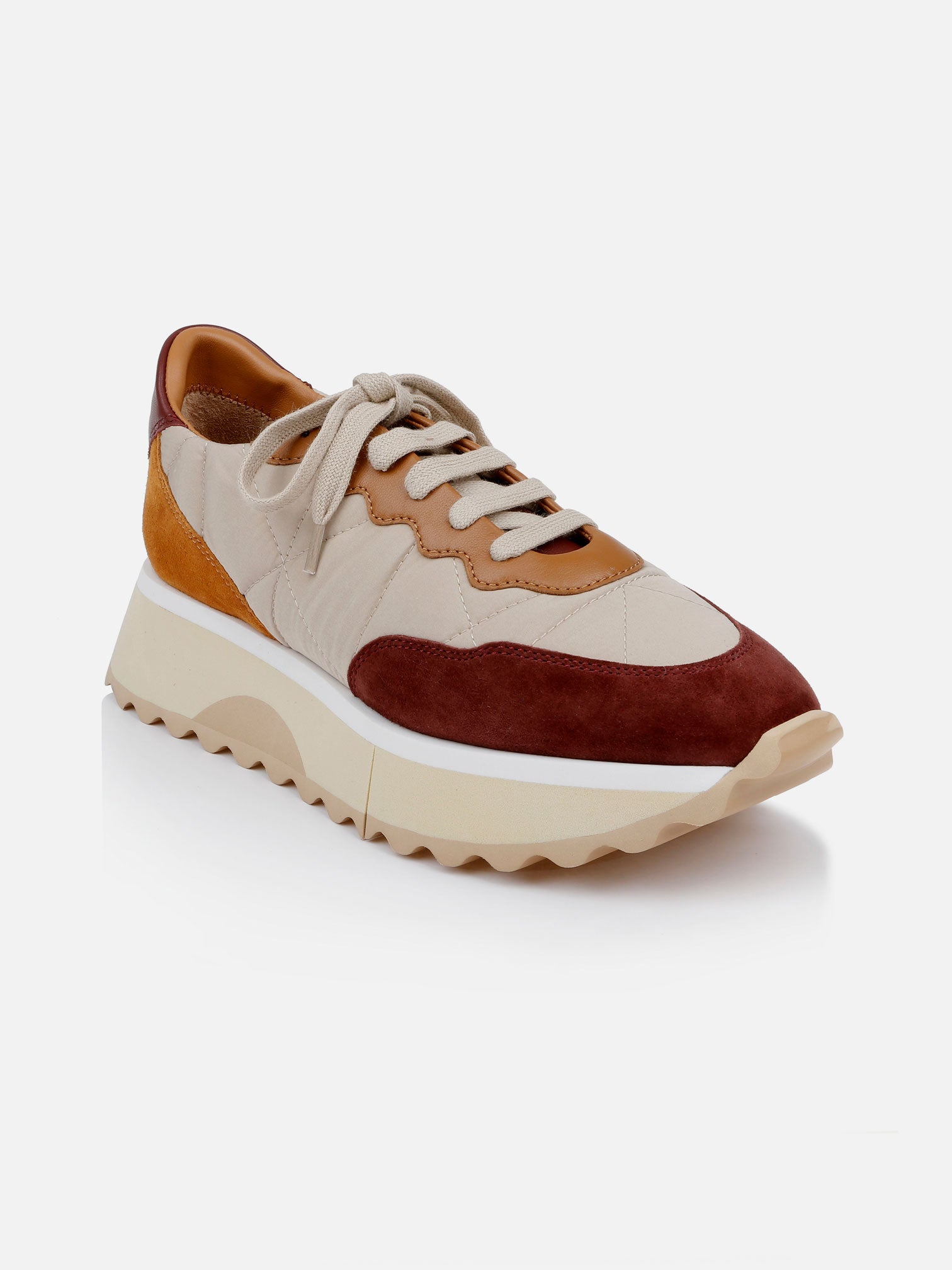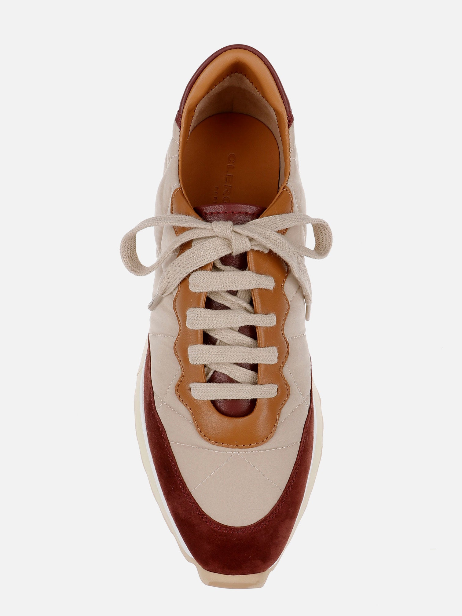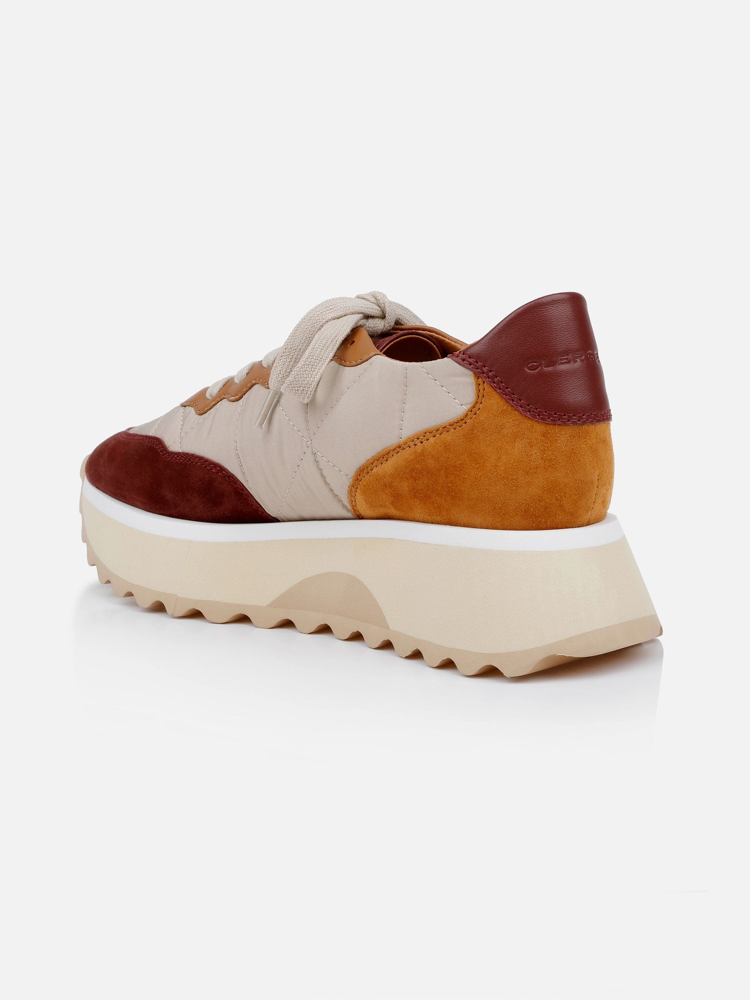 Upper: garnet suede goatskin, nougat puffy fabric, bush lambskin, bush suede goatskin, garnet lambskin / Lining: gold lambskin lining / Sole: straw EVA sole