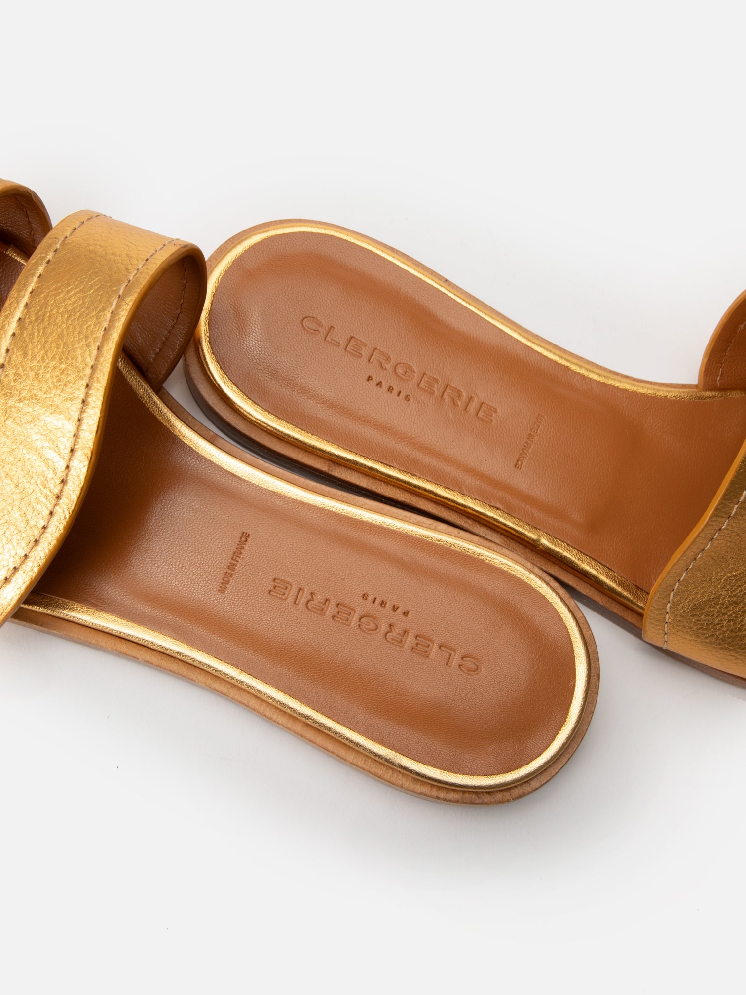 Upper: Golden metallic drummed calfskin / Lining: Gold goatskin / Sole: Amber leatehr sole, natural edge